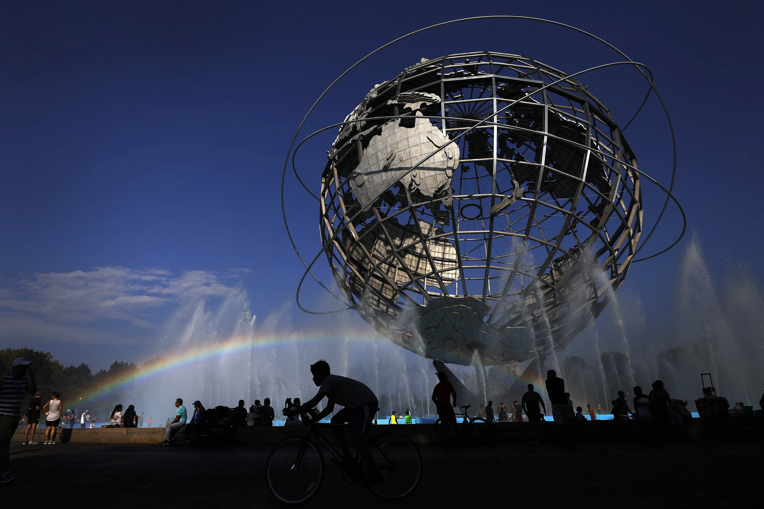 /A cyclist passes under a rainbow at the Unisphere fountain inside Flushing Meadows Corona Park.