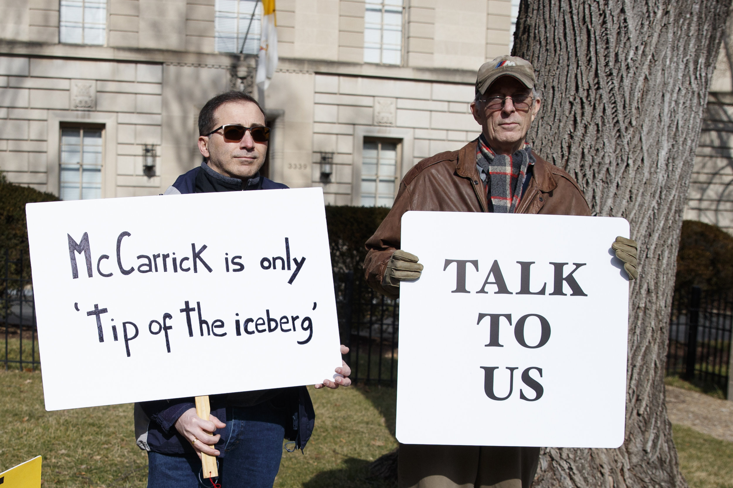 /Luis Carvallo (left) holds a sign that reads "McCarrick is only the 'tip of the iceberg,'" and Bob Foss holds a sign that reads "Talk to Us" outside the Apostolic Nunciature of the Holy See in Washington, D.C., on Saturday. Pope Francis defrocked former U.S. Cardinal Theodore McCarrick after Vatican officials found him guilty of soliciting for sex while hearing confession and of sexual crimes against minors and adults. AP Photo/Carolyn Kaster.