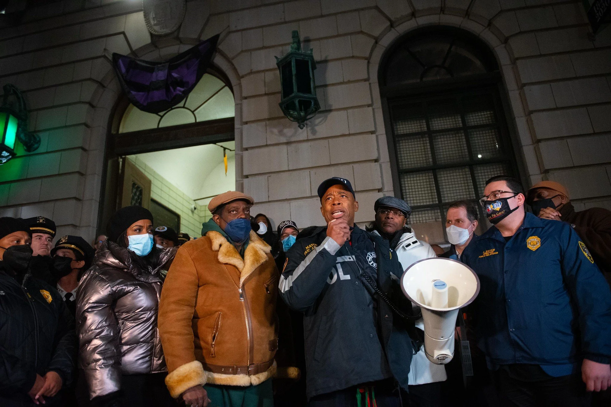 Mayor Eric Adams attends a vigil for the two NYPD officers who were shot, one fatally, Friday night, outside the 32nd Precinct in Harlem on Saturday, Jan. 22, 2022. Photo by Michael Appleton/Mayoral Photography Office