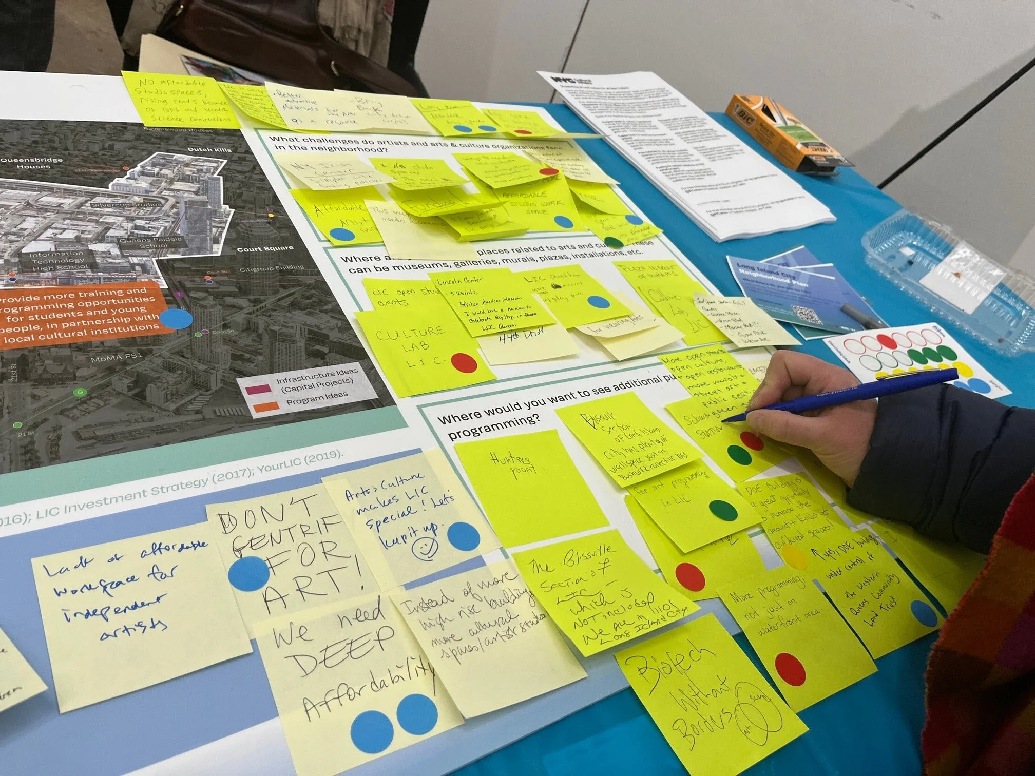 Community members weighed in on potential plans for ONE LIC using post-it notes and stickers. Eagle photo by Ryan Schwach