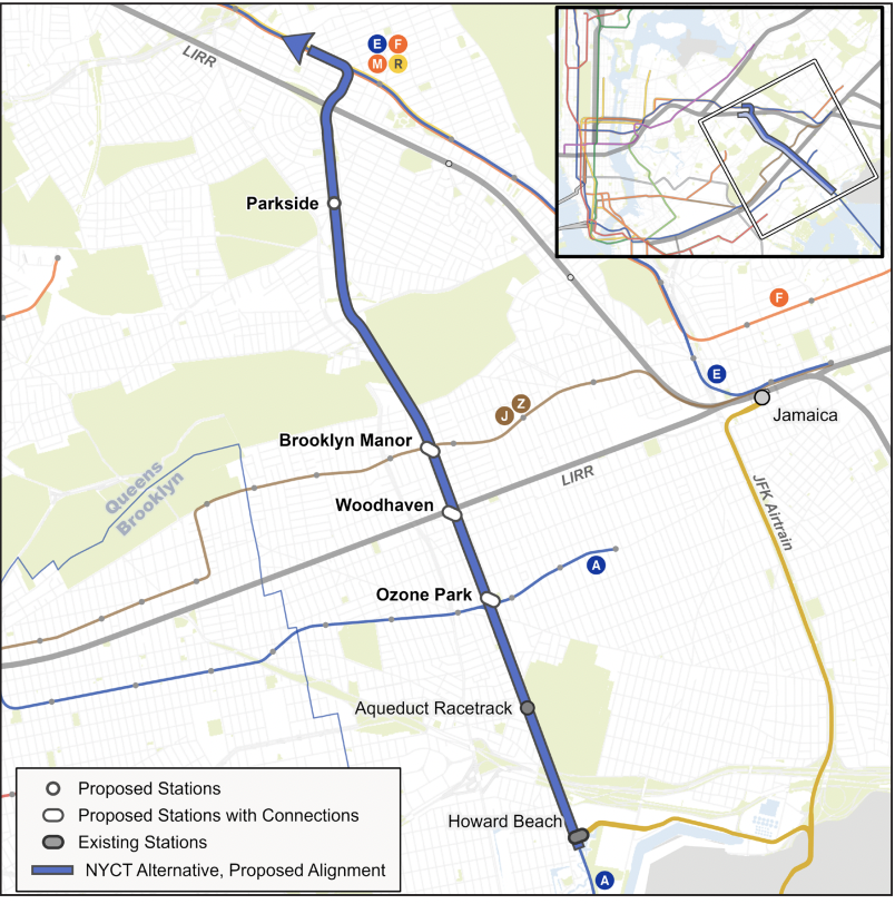 The QueensLink rail line project, which would bring a new train route in Queens, has been hoping to use the empty train tracks that QueensWay will be built on. Screenshot via the MTA