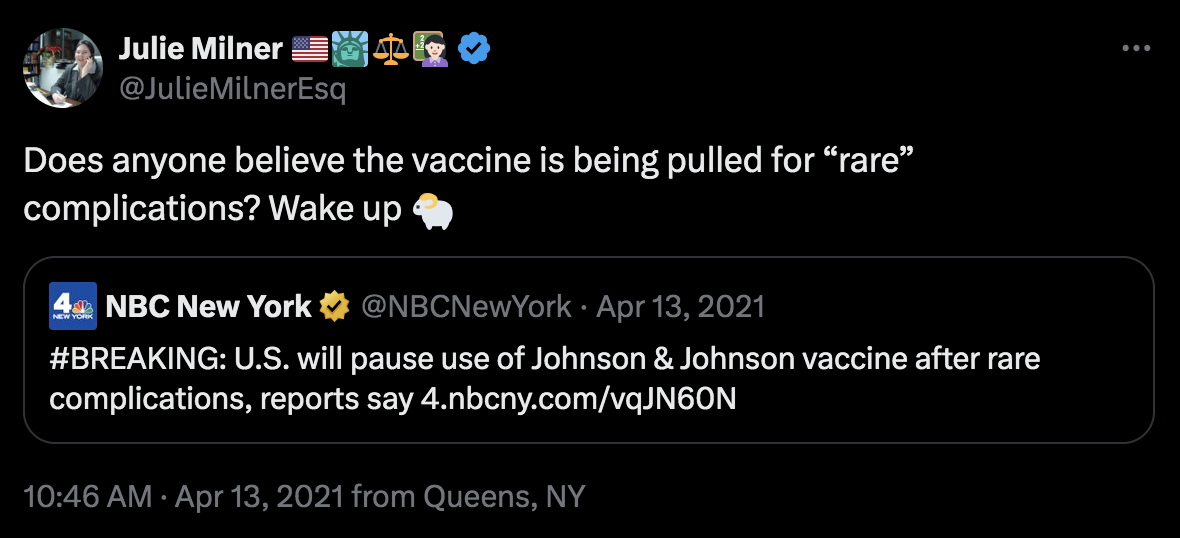 In April 2021, Milner retweeted a story from NBC New York about a pause on the Johnson & Johnson vaccine due to rare complications. In response, Milner said, “Does anyone believe the vaccine is being pulled for ‘rare’ complications? Wake up.”