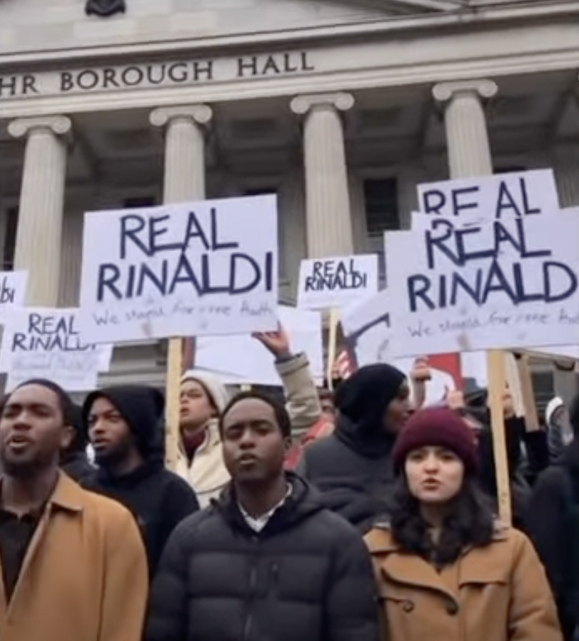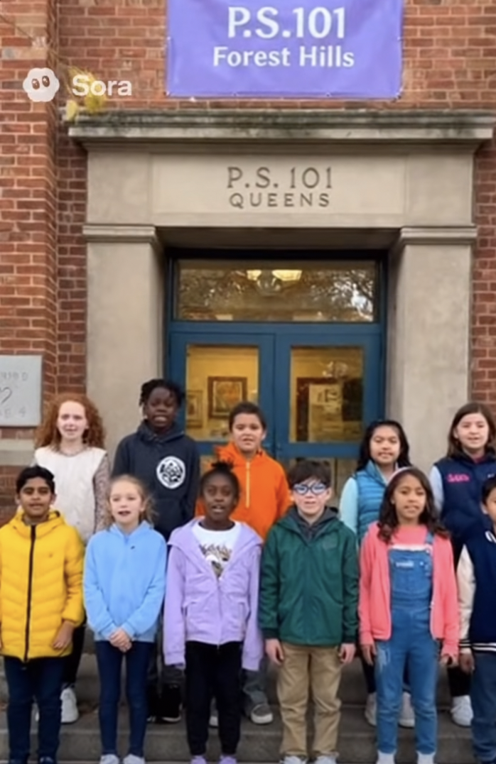 One video depicts a group of Queens students chanting in front of a school: “Make it real, make it Rinaldi, let our voices shine. We're the kids of District 29. Make it real, make it Rinaldi, together we rise. Forest Hills hearts, Queens pride.”