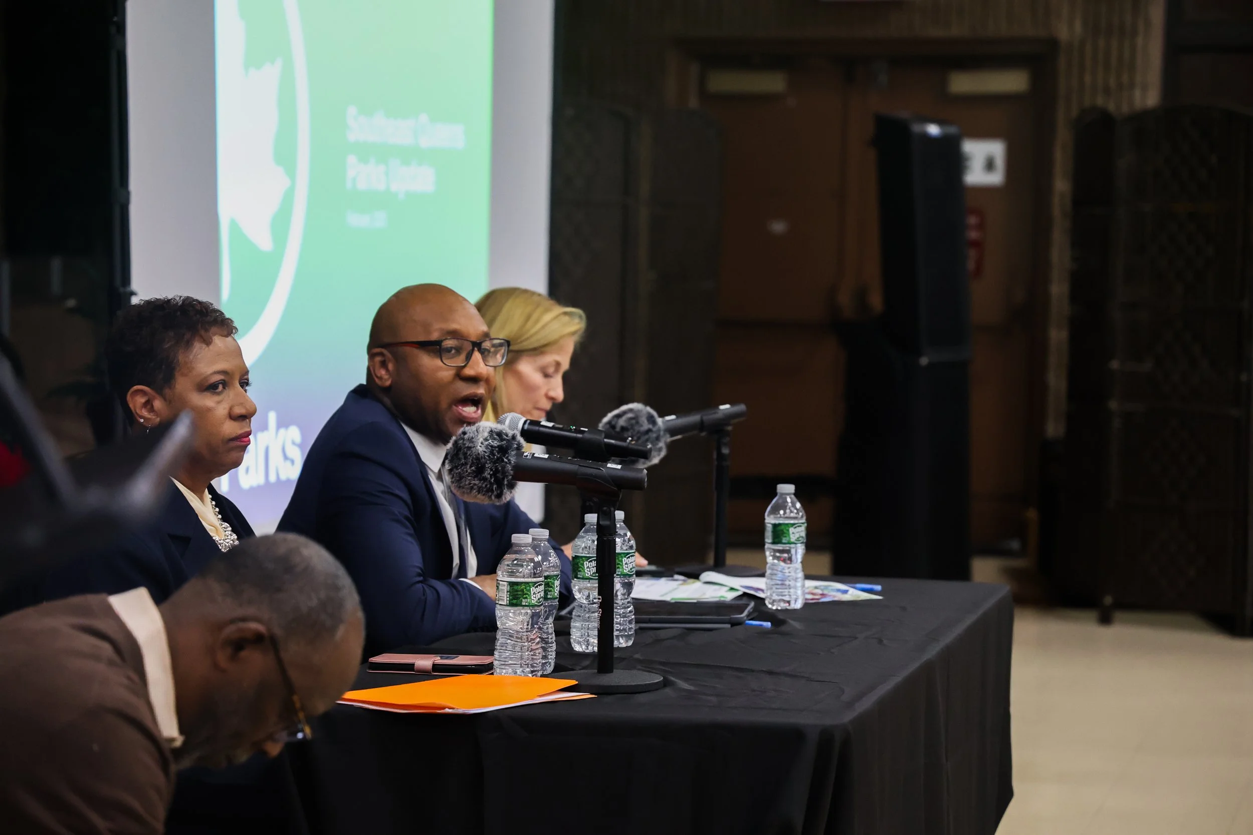 While the meeting was pitched as an opportunity to update locals on a number of park projects in the neighborhood, Richards said the real purpose was to address what he called “misinformation” regarding ongoing negotiations over control of the park between city officials and the South Queens Parks Association, a nonprofit with a checkered past that operates at Roy Wilkins.