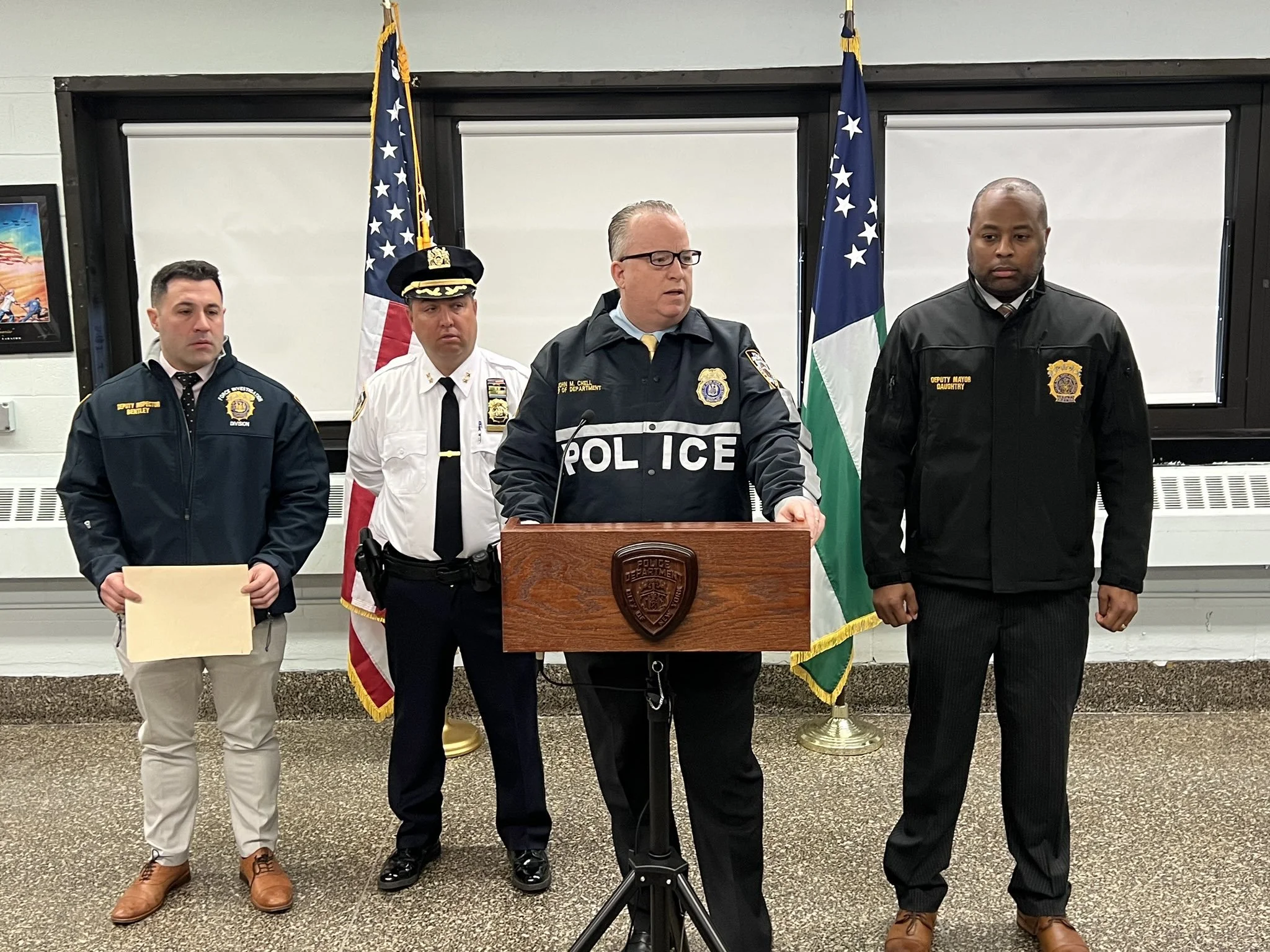 /From left to right, Deputy Inspector Derick Bentley, Assistant Chief Brian Hennessy, Chief of Department John Chell and Deputy Mayor Kaz Daughtry hold a press conference on the 61-year-old man killed by police in Astoria on Monday. Photo via NYPD/X