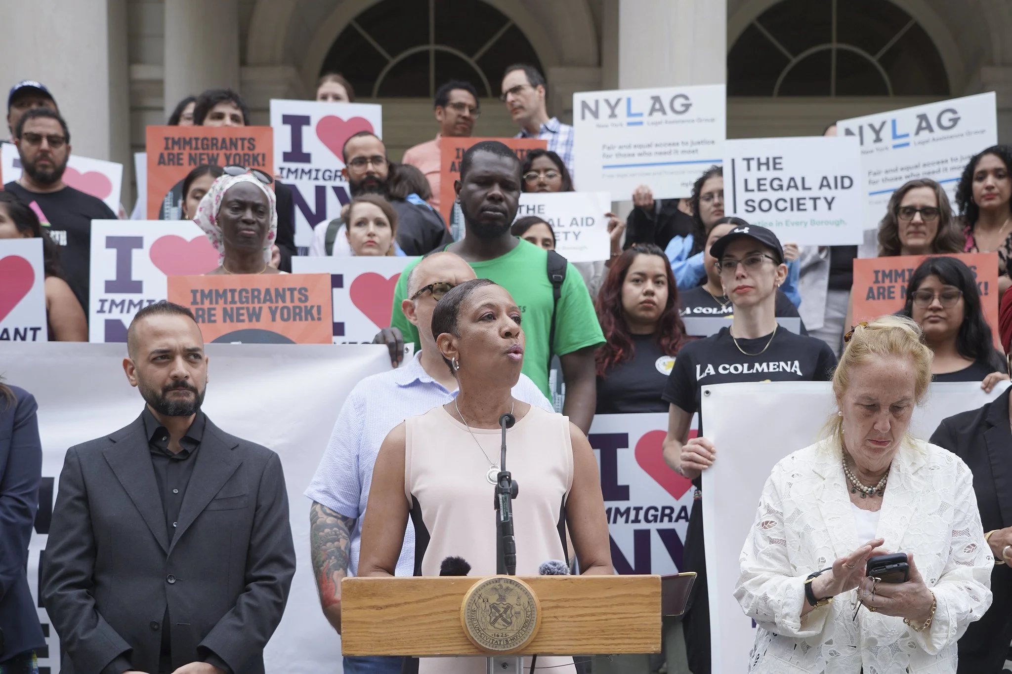 As the June 30 deadline for the city budget approaches, lawmakers and legal advocates gathered on the steps of City Hall on Thursday demanding more funding for immigrant legal services.