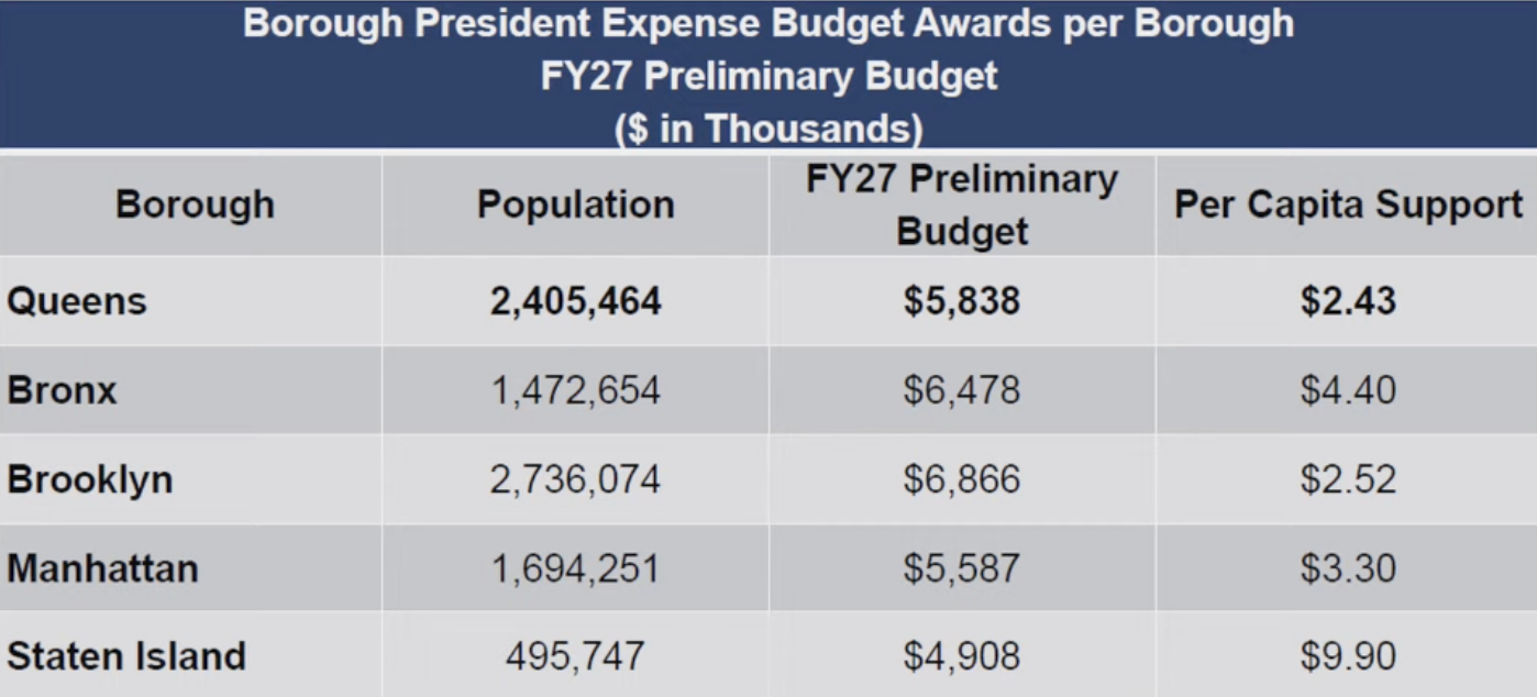 The Queens borough president would receive $2.43 per capita in expense funding, or nine cents less than the Brooklyn BP’s office and more than $7 less than the Staten Island BP’s office.