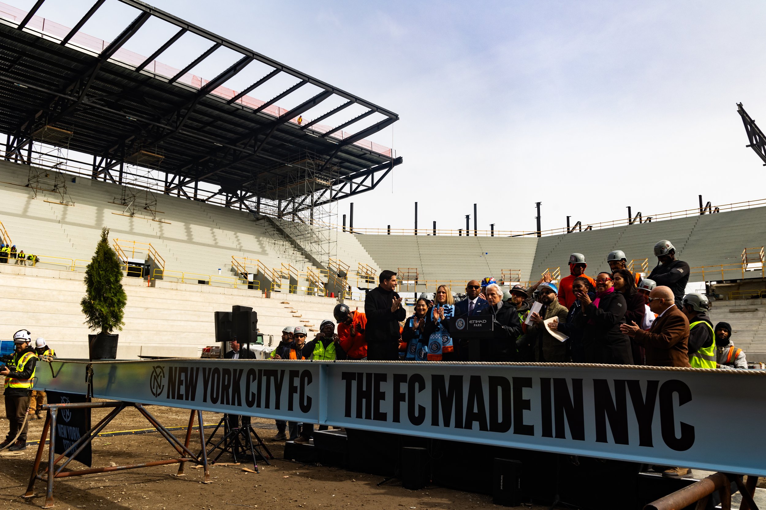 Officials, union leaders and representatives from New York City Football Club raised the NYCFC-blue colored beam into the rafters of the still-under-construction stadium on Wednesday as work toward creating a new community at Willets Point continued.