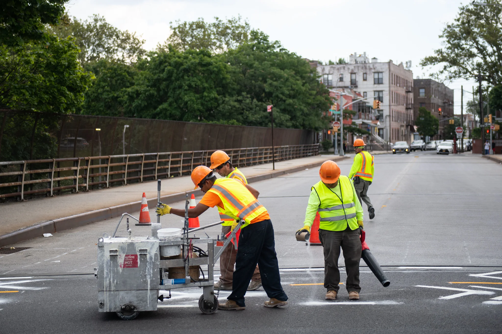 /City workers paint new bike lane lines on a street. Michael Appleton/Mayoral Photography Office.