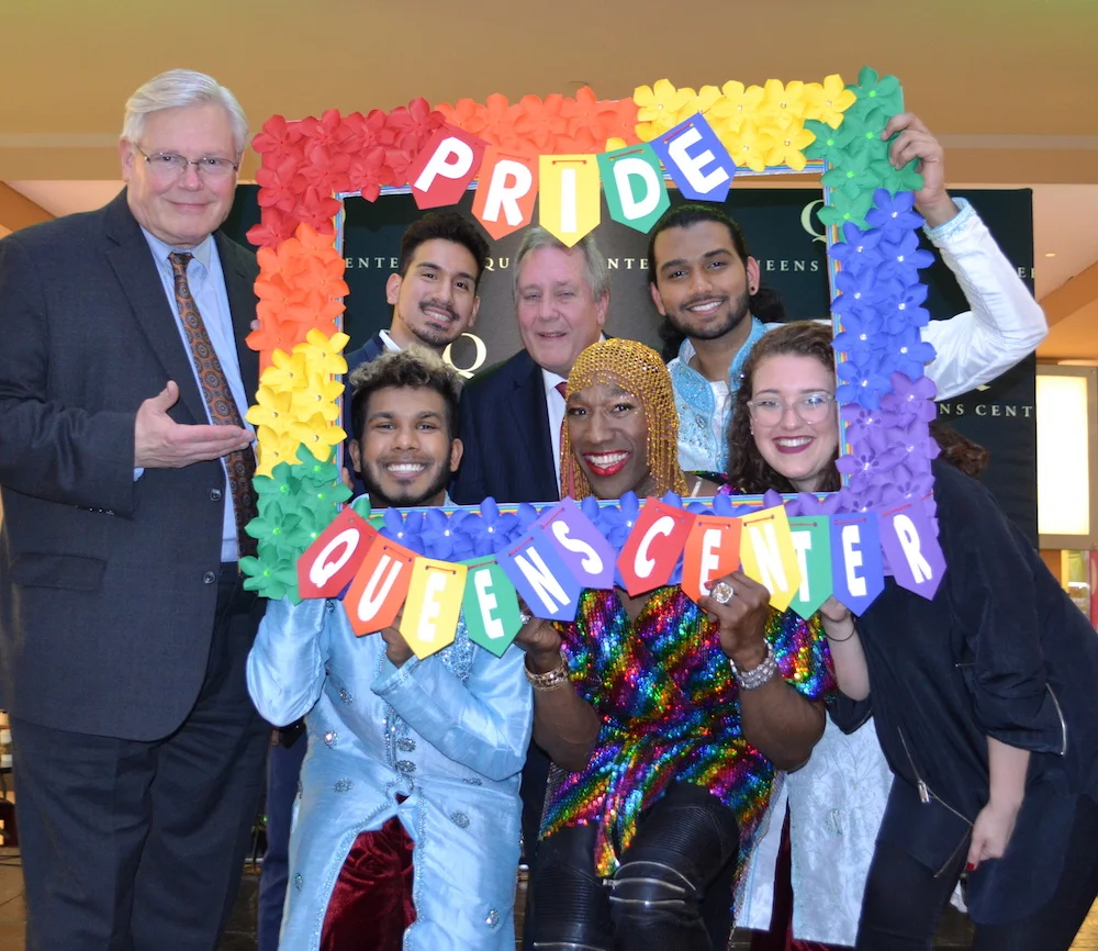 Former NY State Senator Thomas "Tom" Duane (standing, far left); top row: LGBTQ activist and social worker Brian Romero, Council Member Daniel Dromm, dance artist Rajeev Singh; bottom row: dance artist Sean Kulsum, vocalist Anthony Wayne, and Generation Q Director Lindsey Duel celebrate LGBT Pride at Dromm's annual event at Queens Center Mall. Photo courtesy of the Office of Daniel Dromm.