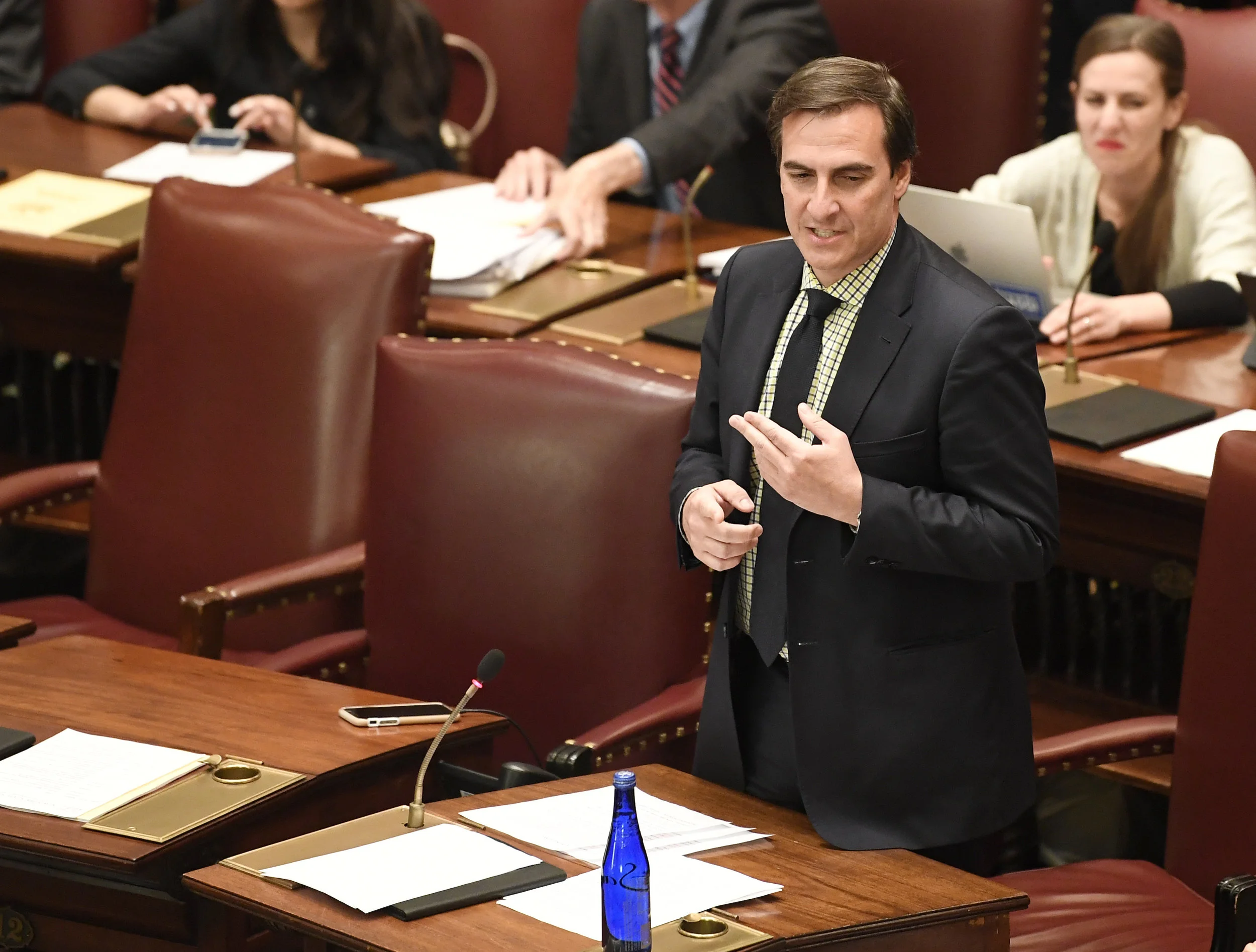 /Sen. Deputy Majority Leader Michael Gianaris speaks to members in the Senate Chamber earlier this month. AP Photo/Hans Pennink.