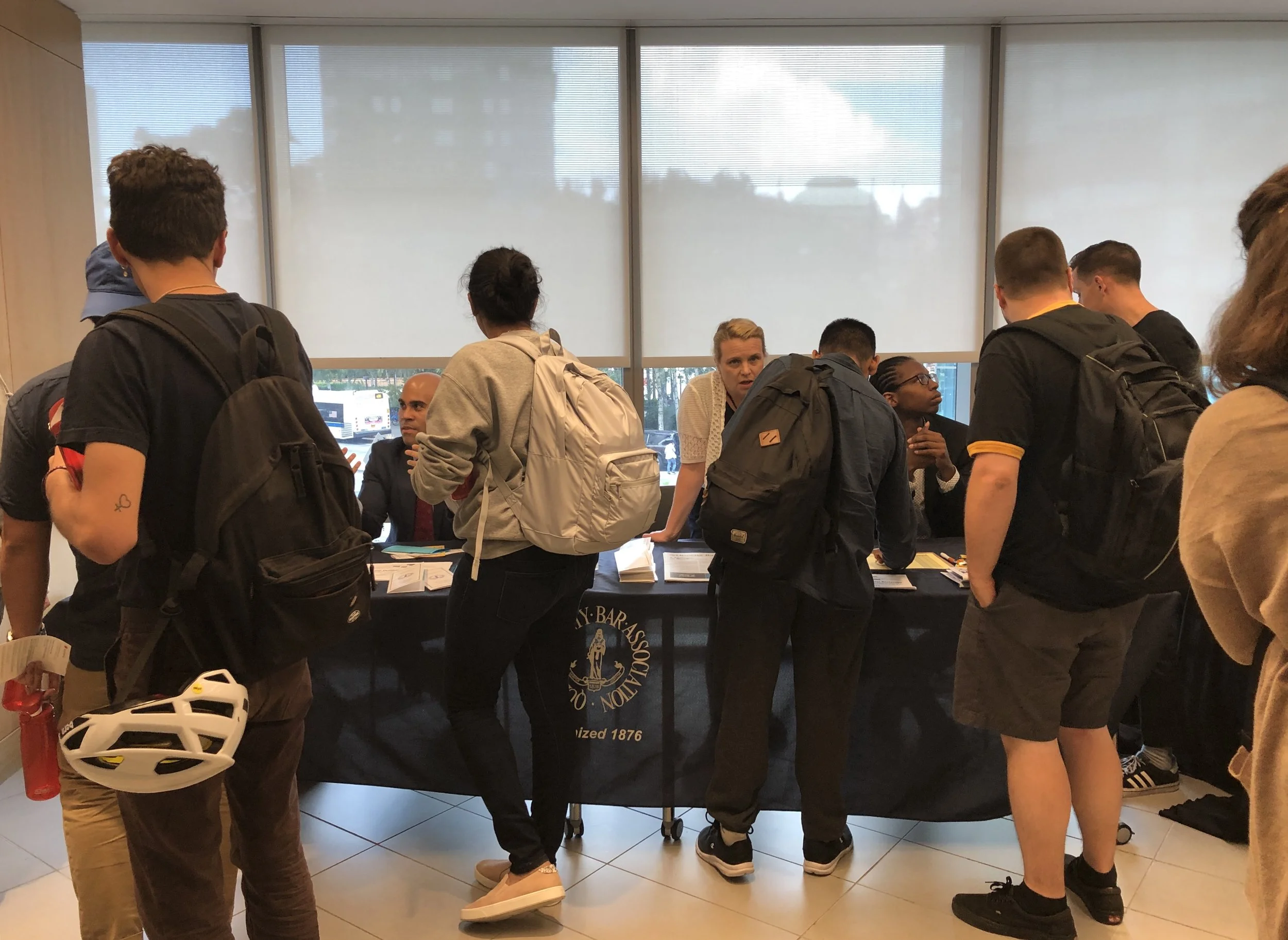 QCBA President Marie-Eleana First, Law School Liaison Committee co-chair Joel Serrano and 2L Student Ambassador Tycel Harris were ready and waiting at the Long Island City law school when the new students left orientation. The QCBA reps posted up at a table strategically placed along the line for free pizza.