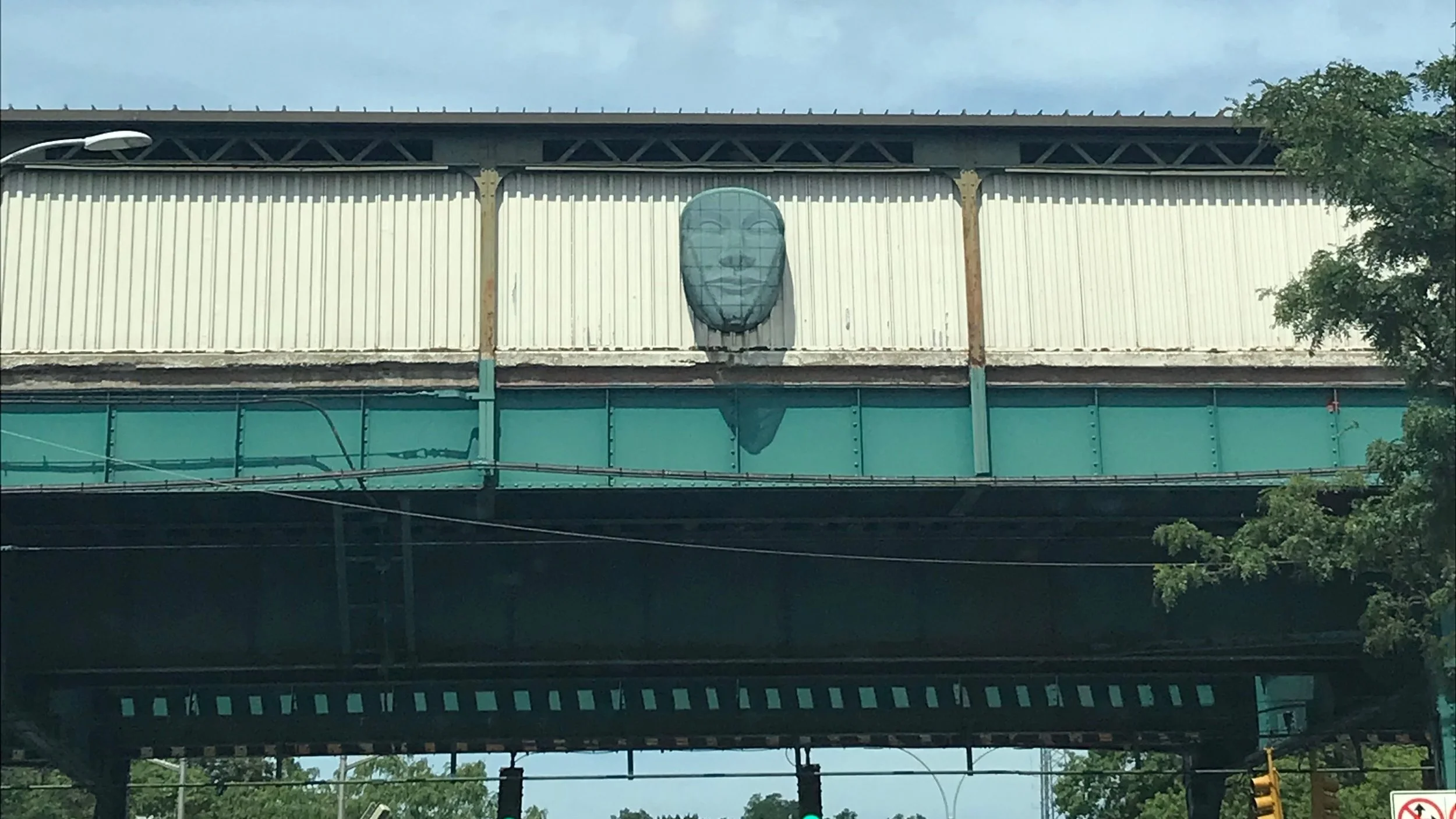The faces are the work of artist Kathleen McCarthy, and can be found at every J/Z train station between Cypress Hills in Brooklyn to 111th Street in Richmond Hill. Known as “Five Points of Observation,” the faces were designed between 1990s and 1993 out of copper mesh.
